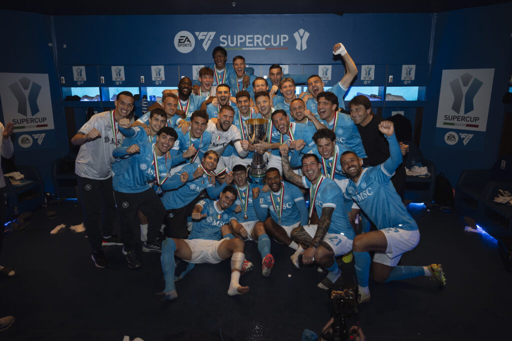 Il Napoli si gode la magnifica notte di Riad con il successo per 2-0 contro il Bologna e la conquista della Supercoppa Italiana. Scattano i festeggiamenti in campo e poi nello spogliatoio, con il gruppo azzurro che si lascia andare a scherzi, sorrisi e foto ricordo.