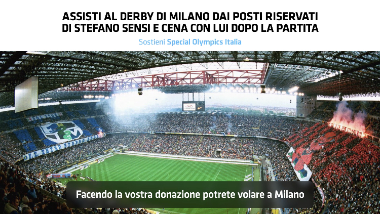 Su www.wishraiser.com/sensi è online la nuova campagna di beneficenza con Stefano Sensi, che mette in palio per i donatori la possibilità di vincere un premio speciale. I fan dell’Inter e di Sensi non solo sosterranno l’impegno di Special Olympics Italia Onlus, ma potranno anche vivere un’esperienza emozionante con il campione che include: un viaggio per due persone a Milano per assistere al match Inter-Milan del 9 Febbraio dai suoi posti riservati allo stadio San Siro, la sua maglia autografata con dedica e una cena con lui nel suo ristorante preferito a Milano subito dopo la partita. Un’esperienza irripetibile per tutti i fan di Stefano Sensi e gli appassionati del mondo del calcio. Volo e Hotel inclusi per due tifosi interisti da tutta Italia.