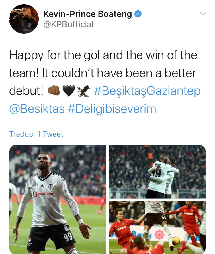 Debutto coi fiocchi per Boateng con la maglia del Besiktas. Il ghanese ha segnato la seconda rete nella vittoria per 3 a 0 con il Gaziantep, dopo 25 minuti dal suo ingresso in campo. Un altro esordio da ricordare grazie a uno spettacolare colpo di tacco.